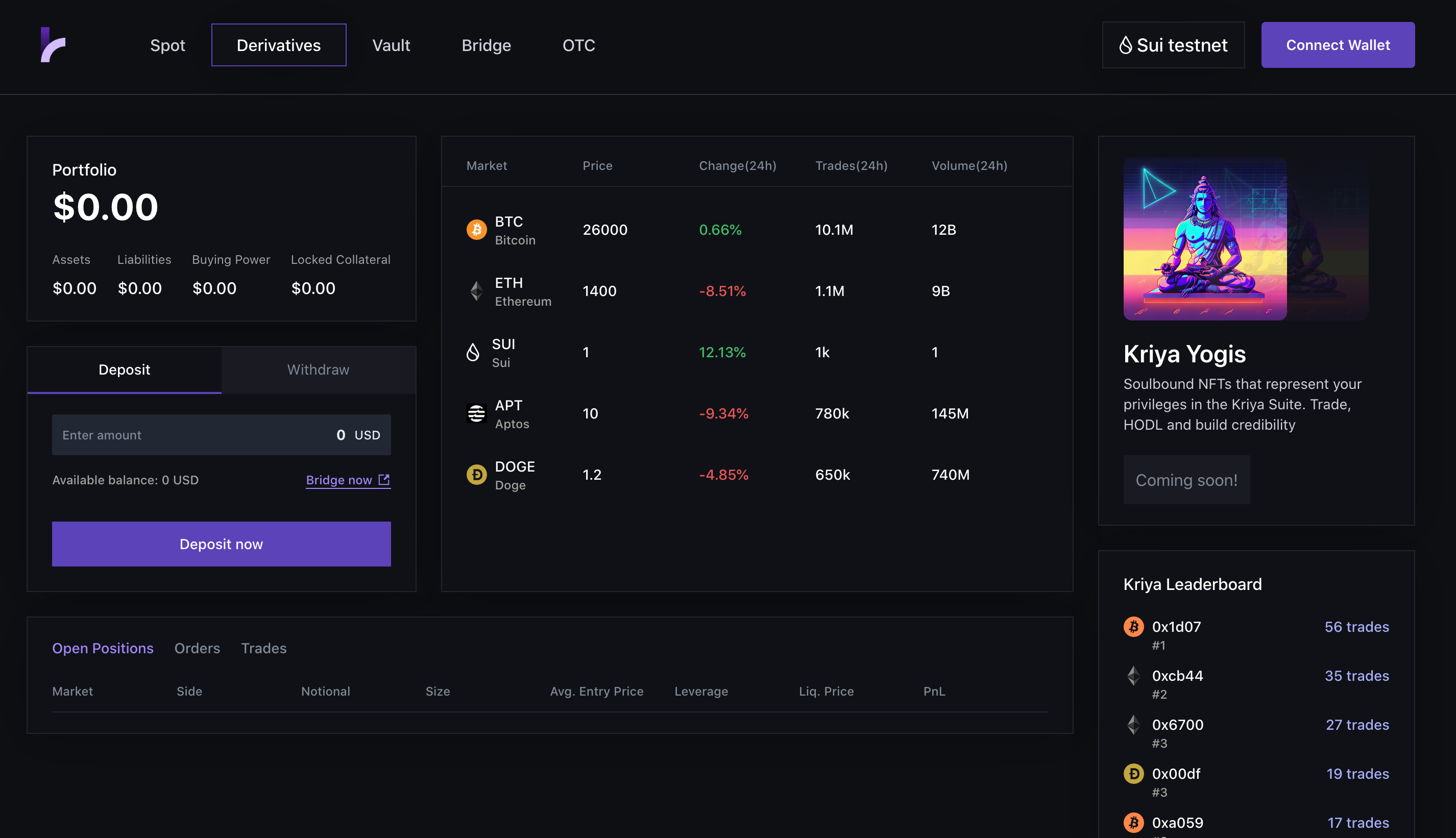 Kriya DEX is a non-custodial orderbook-based DEX built for trading under-collateralized derivatives likes perpetuals, dated futures and options.&#x20;