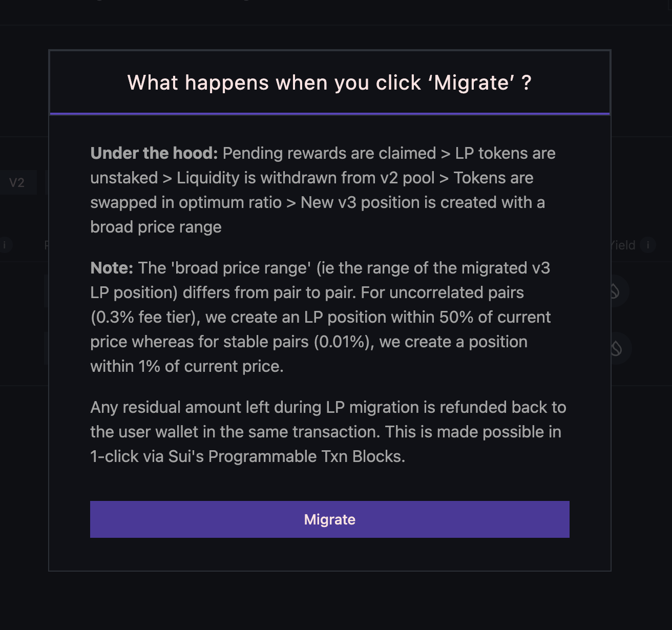 We’ve made migration a simple 1-click process via Sui PTBs. All LPs are advised to migrate their capital to the new pools to continue earning yield.&#x20;